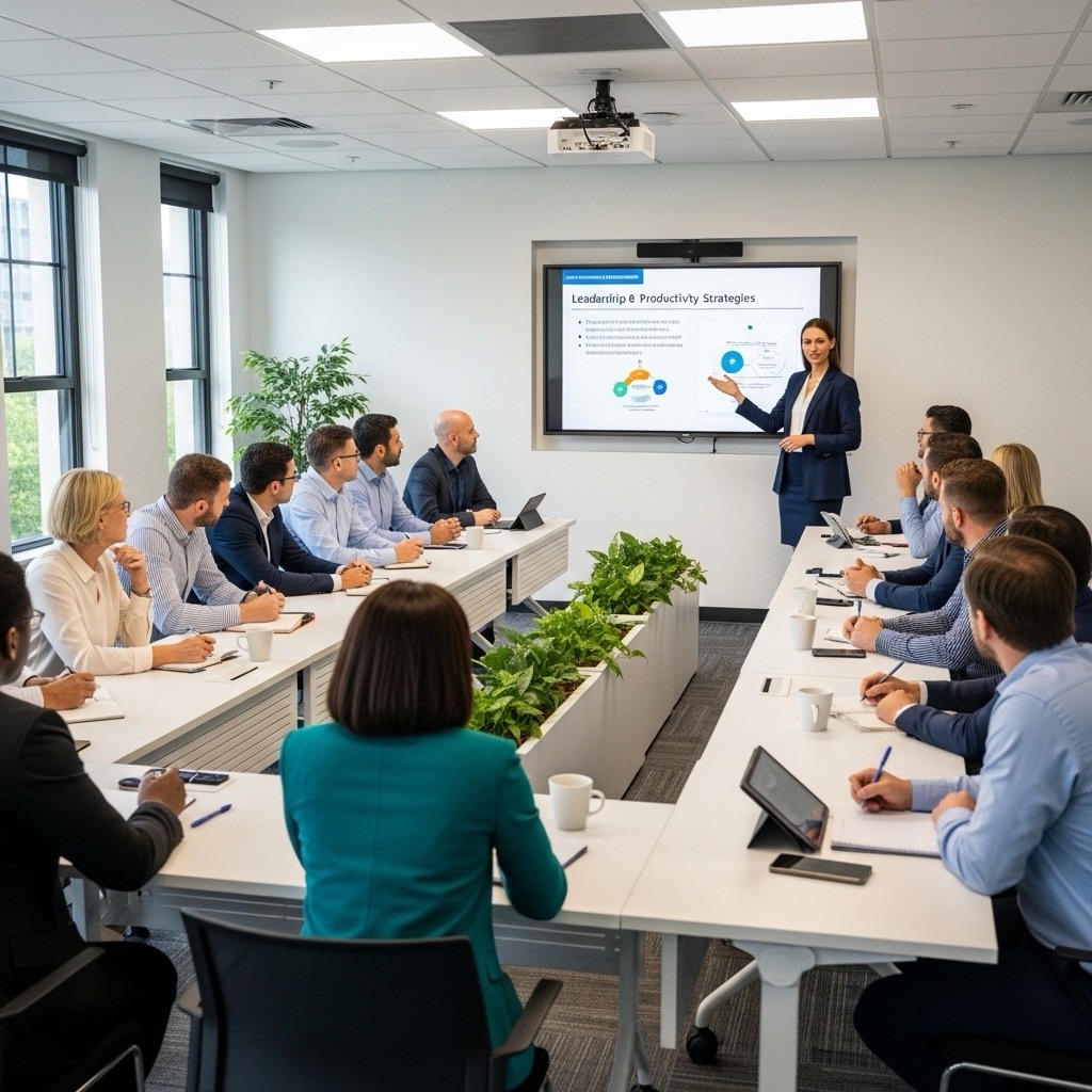 “A modern training room filled with corporate employees listening attentively to a professional trainer presenting leadership and productivity strategies on a large screen. The atmosphere is bright and collaborative, emphasizing business learning.”